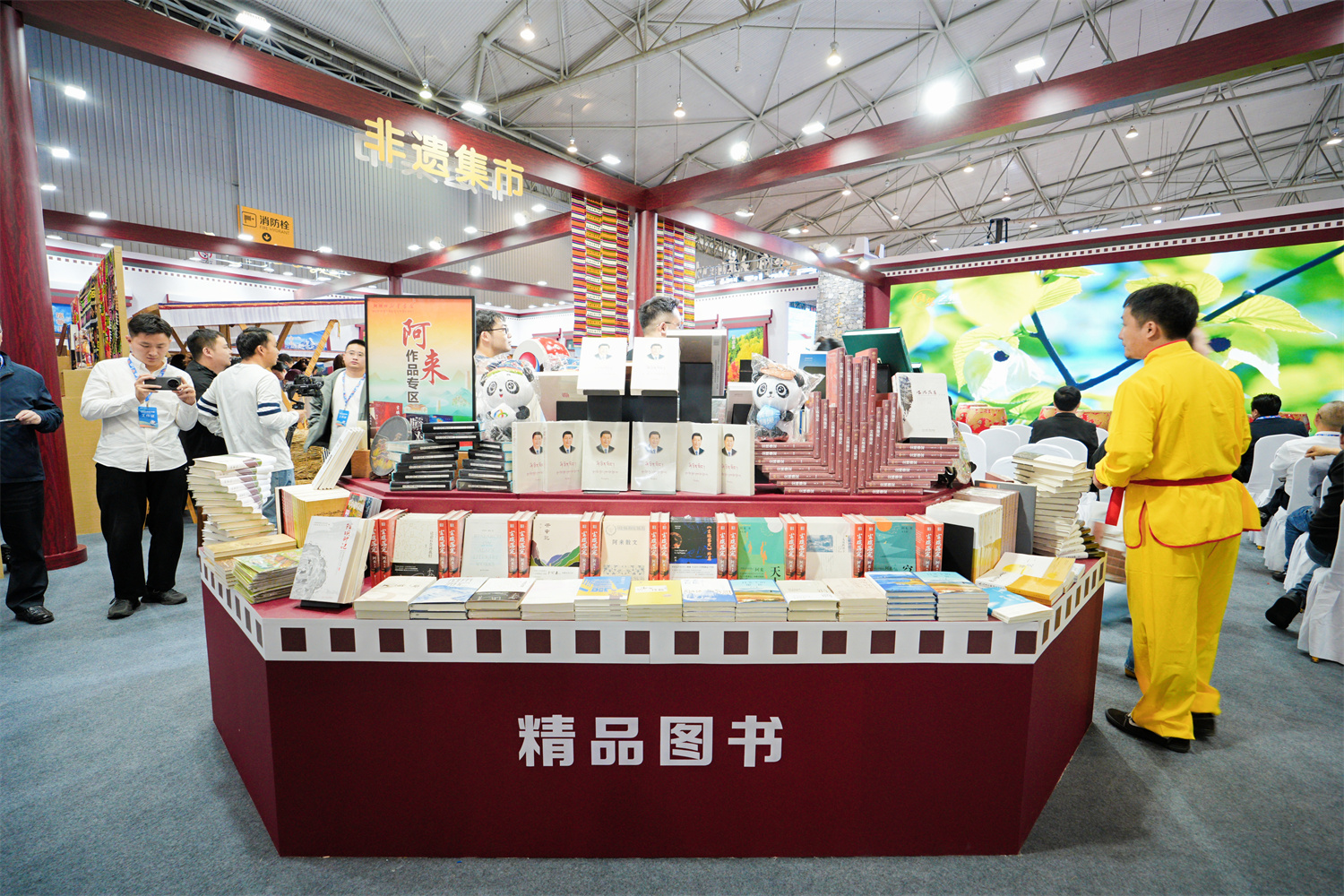 在精品图书展区,集中陈列阿坝州相关出版物共137种、769册,涵盖历史文化、民族文化、风景摄影、本土文学及青少年读物等。特别设立“阿来作品专区”“本土作家作品专区”,重点展示《阿坝州文库》《中华羌族历史文化集成》《嘉绒地区历史文化丛书》等精品图书。