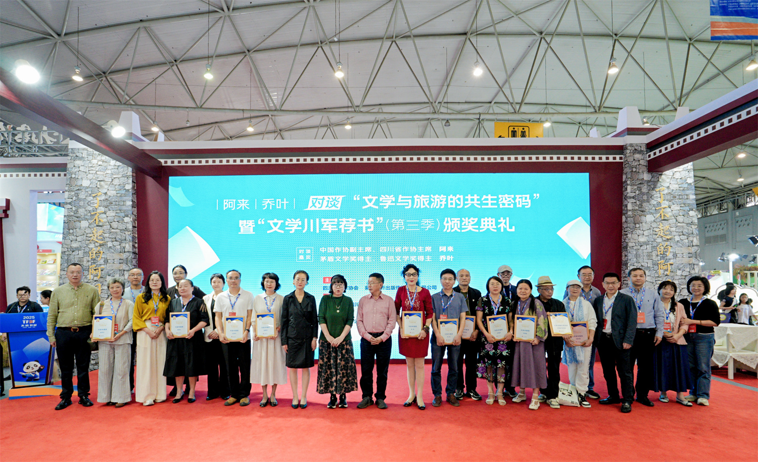 2025年10月18日下午,“阿来、乔叶文学对谈暨‘文学川军荐书’(第三季)颁奖典礼”的天府书展主展场阿坝展区举行。本次活动由四川省作协、新华文轩出版传媒股份有限公司(以下简称“新华文轩”)主办,读者报社、四川省作协创联部承办,四川出版发展公益基金会协办。中国作协副主席、四川省作协主席阿来,第十一届茅盾文学奖、第五届鲁迅文学奖双奖得主乔叶,四川省作协党组副书记鲁娟,四川新华出版发行集团党委委员、副总经理柯继铭,中共阿坝州委常委、宣传部部长依当措,新华文轩党委委员、副总经理邹健,四川出版发展公益基金会秘书长谭清洁,四川画报社社长罗彬,以及获奖作家会员、各地作协代表等出席本次活动。