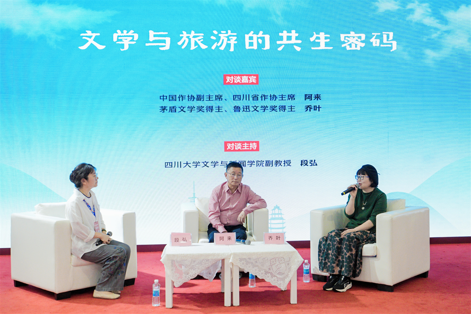颁奖典礼之外,现场还为大家呈现了一场重量级文学盛宴——两位茅盾文学奖获得者阿来与乔叶围绕“文学与旅游的共生密码”这一主题展开深度对话,本次对谈特别邀请到四川大学文学与新闻学院副教授段弘女士担任主持。