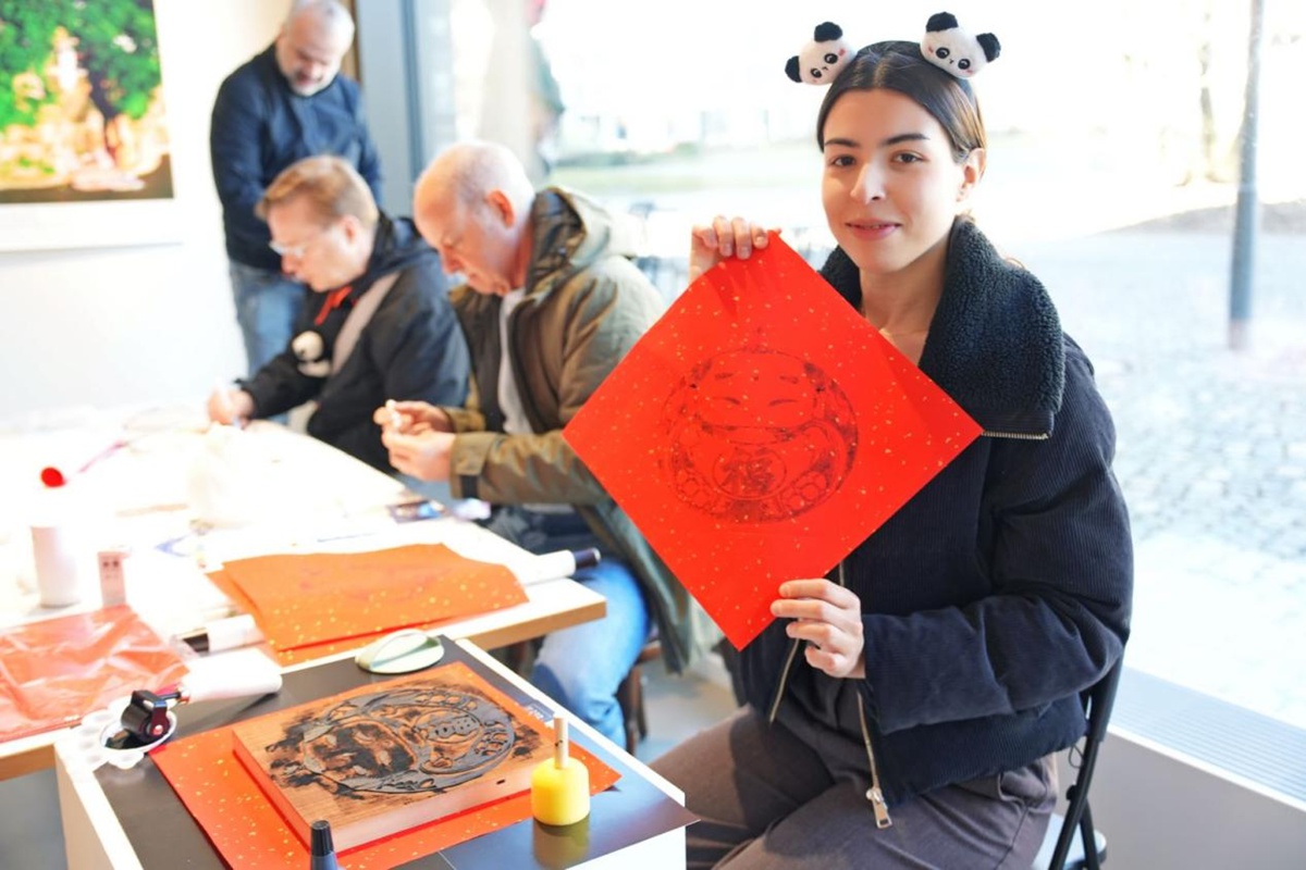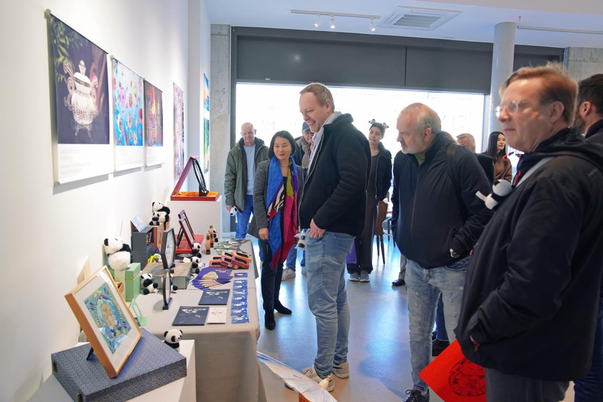 在古筝弦音之间,柏林市民纷至沓来,现场展出20余幅四川文旅精品图片,涵盖大熊猫栖息地、九寨沟、黄龙、三星堆、乐山大佛等世界级遗产及自然保护区;成都漆器、熊猫主题蜀绣等十余件非遗文创作品集中亮相,直观展现出天府文化的深厚底蕴。互动体验区的年画他因、彩绘熊猫、熊猫卷轴绘制等体验项目,让柏林市民在沉浸式氛围中感受到了“安逸四川”的生活美学与独特魅力。