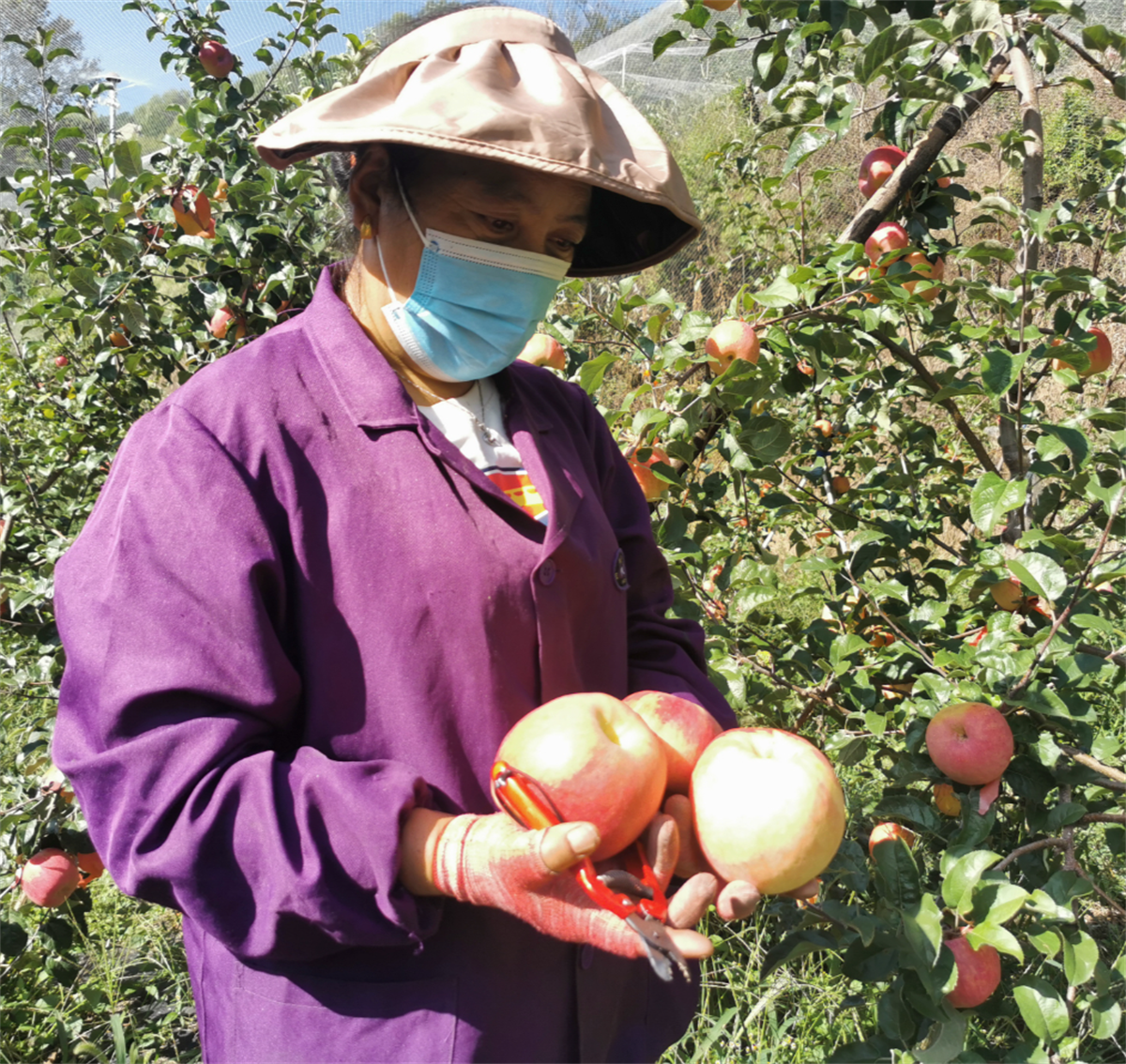 丹巴出产的苹果口感更好、更甜、外观也更漂亮,是名副其实的美人脆。今年59岁的中级农技师上官宣司,来自“秦脆”之乡陕西,从事苹果种植研究已经30多年,作为“秦脆”落户丹巴的发起人之一,他还被丹巴县农牧局特聘为技术员,技术指导“美人脆”的种植和管护。