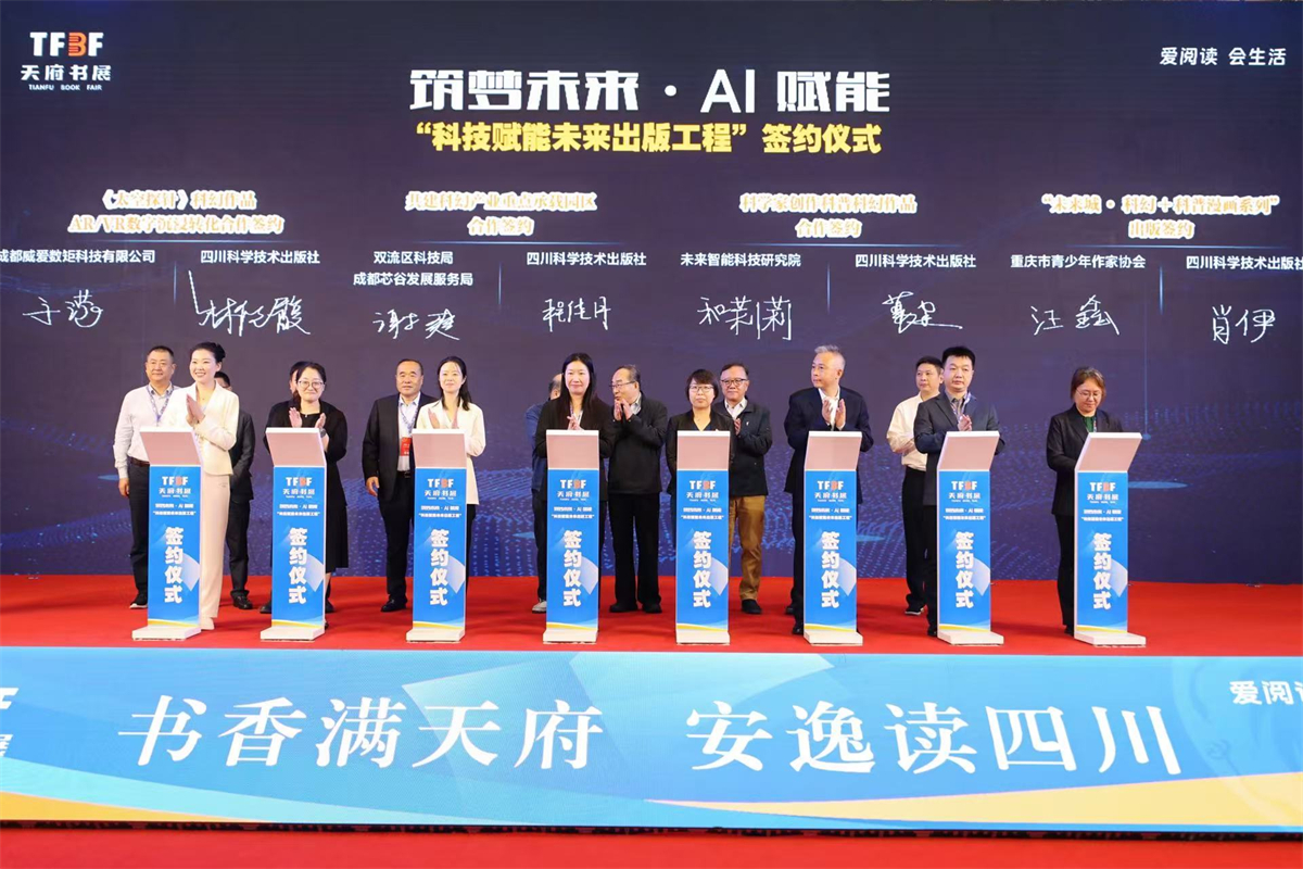 2025年10月18日,由新华文轩出版传媒股份有限公司主办,四川科学技术出版社、成都芯谷发展服务局、未来智能科技研究院承办,重庆市青少年作家协会、成都威爱数矩科技有限公司协办的“筑梦未来·AI赋能——‘科技赋能未来出版工程’签约仪式”在天府书展上成功举办。
