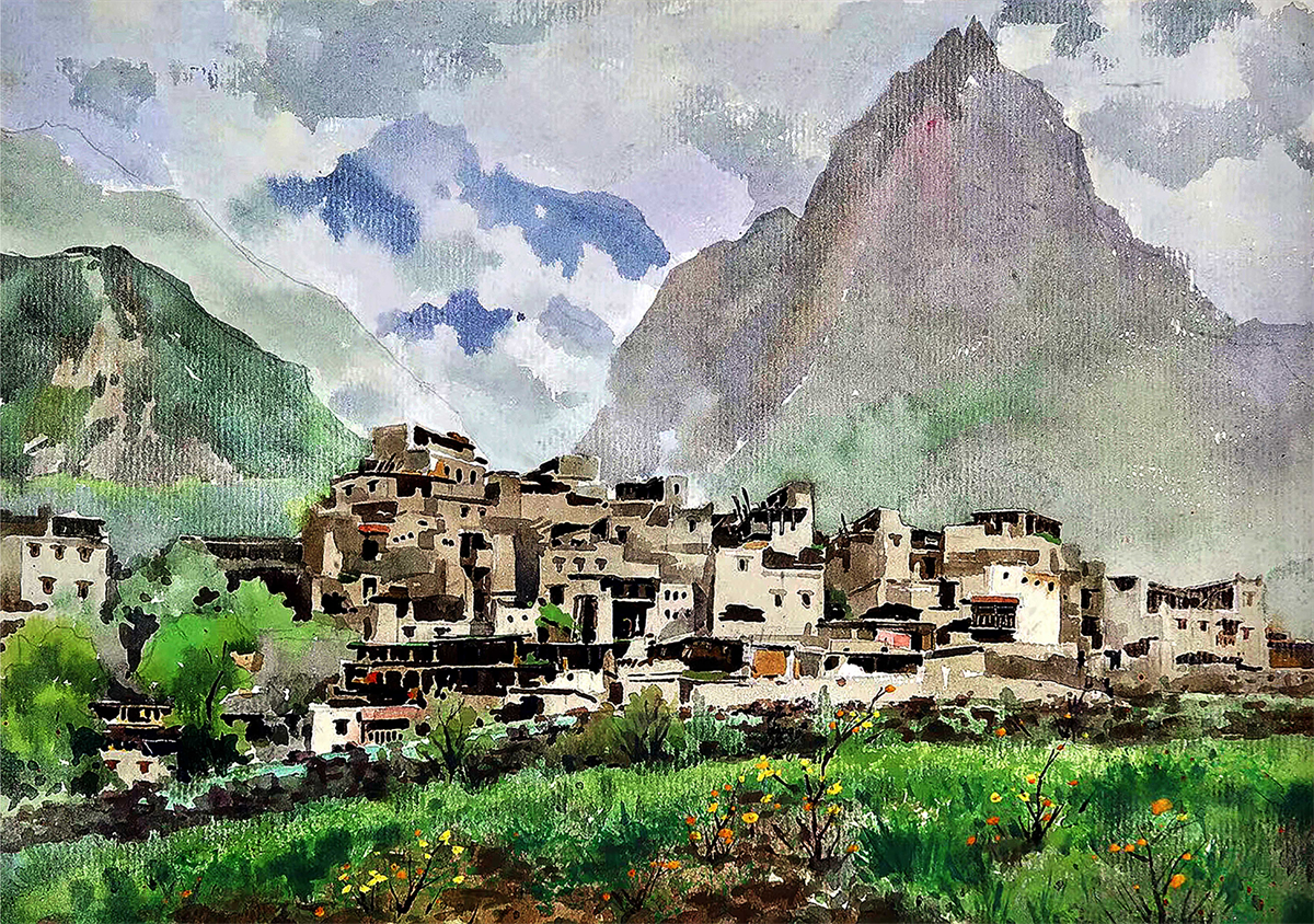 羌寨(水彩画)罗次冰