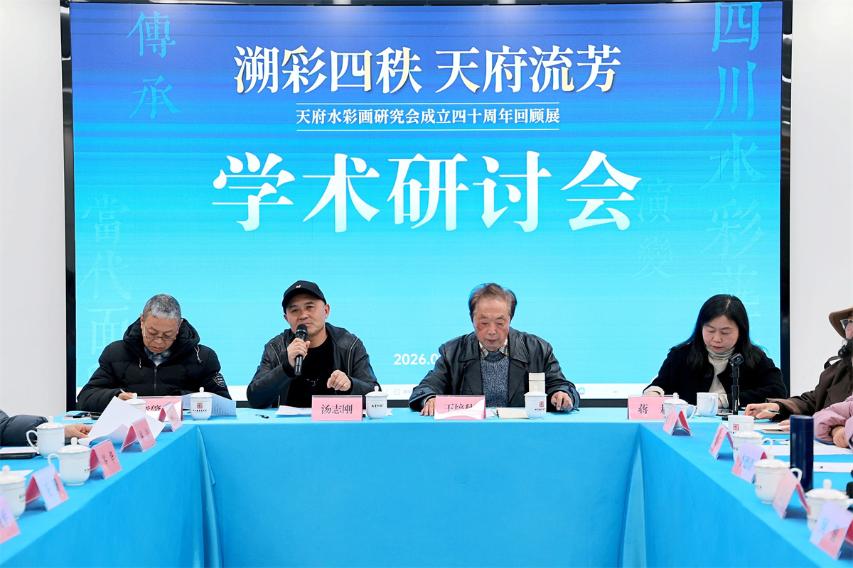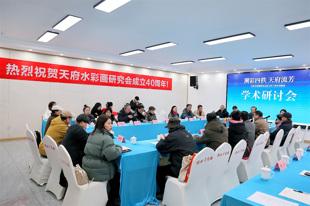 开幕式后,“溯彩四秩・天府流芳”——天府水彩画研究会成立40周年回顾展学术研讨会举行。与会嘉宾围绕研究会发展历史、水彩艺术的地域发展路径与当代创新转化等核心议题,展开深入交流探讨。
