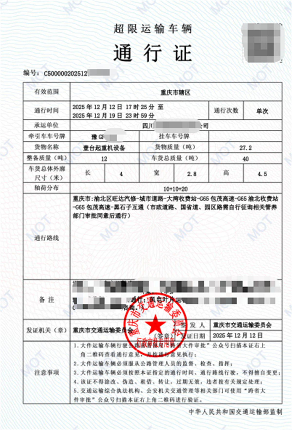 近日,四川某运业有限公司通过“川渝通办一件事”专区,成功办理超限运输车辆通行证等相关证件,该企业负责人感叹:“以前川渝两地办理标准、流程环节、审批时限存在一定差异,对于我们跨区域经营大件运输来说,需要多头跑、两地看,耗费大量人力成本和时间成本,车辆多停一天,成本就会增加几千元。现在,通过川渝大件运输“一件事”一次办好,省时省力,为我们企业腾出了宝贵的运营周期,这是真金白银的实惠!”