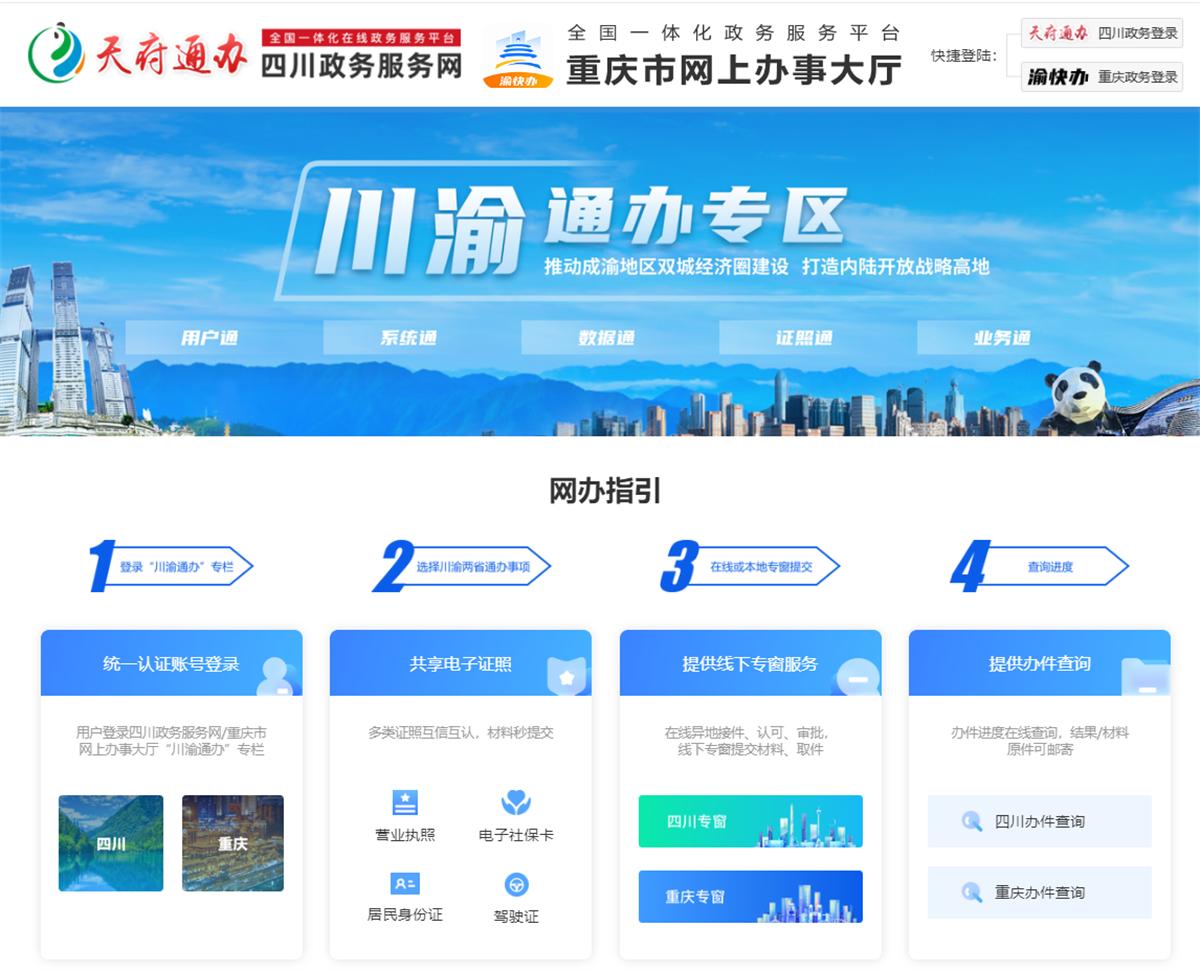 打破区域限制,畅通服务渠道,线上入驻两地政务服务平台“川渝通办一件事”专区,申请人可自主选择两地平台提交在线申请,实现“一次登录、线上办理”。线下进驻两地政务服务大厅“川渝通办”专窗,申请人现场提交申请,窗口寄递或网转办理,实现“就近交件、异地可办”。申请人可登录四川“天府通办”或重庆“渝快办”个人中心查询办理进度,并通过移动端掌上领取电子证照,最大限度利企便民。