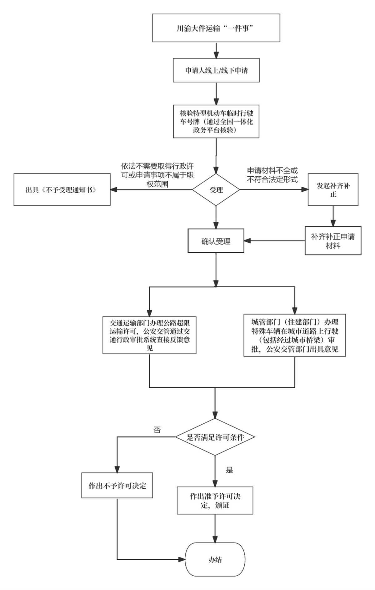 两地交通运输部门坚持“一盘棋”思维和“一体化”理念,按照“业务集成、流程优化、服务协同、信息共享”协作推进,联合印发《川渝大件运输“一件事”实施方案和办事指南》,将关联性强、办理量大的公路超限运输许可、特殊车辆在城市道路上行驶(包括经过城市桥梁)审批、特型机动车临时行驶车号牌核发等3项业务集成办理,统一两地适用范围、办理条件、办事流程、办理时限等要素标准。优化业务流程、强化数据赋能,审批时限从41个工作日压缩至8个工作日,提速80.5%;申请材料从23份精简为11份,减少52.2%;实现线上“零跑动”、线下“跑一次”,企业办事成本大幅降低。