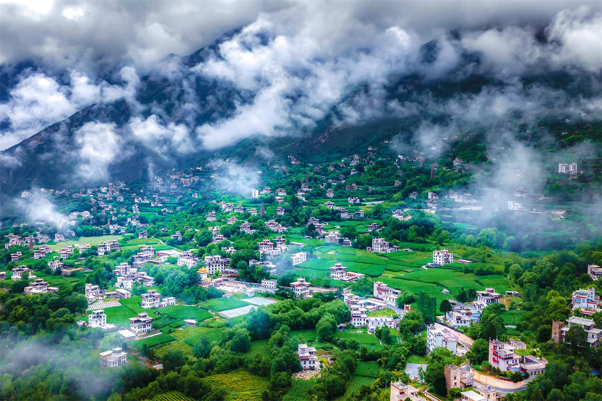 云雾缭绕的基卡依村美如仙境 (丹巴县委宣传部供图)