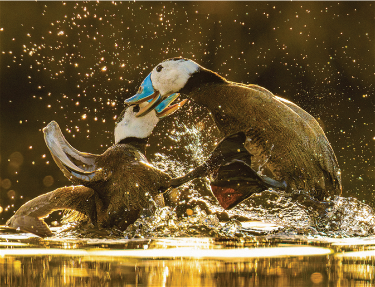 水花与荷尔蒙——为了争夺交配权、两只雄性白头硬尾鸭大打出手(中国新疆)