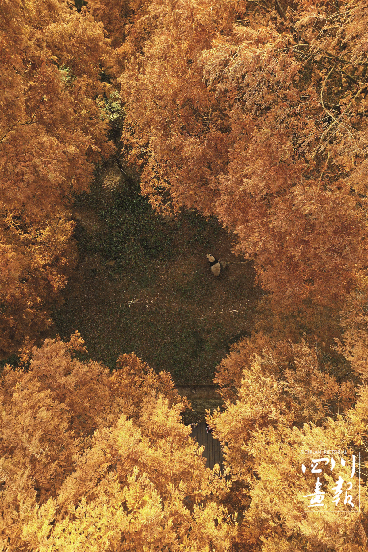 中国大熊猫保护研究中心都江堰基地,大熊猫在水杉林下漫步(肖飚 摄)