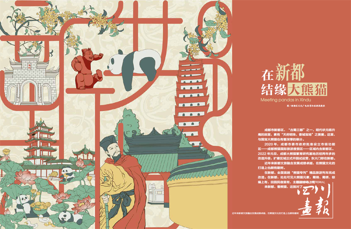 新都文旅融合发展成效显著,在熊猫文化打造上也颇有建树。在新都,全国首趟“熊猫专列”精品旅游列车完成改造,处处可见大熊猫元素,蜀锦、蜀绣、棕编、田园民宿、主题篮球场上都有……到新都看熊猫就对了。