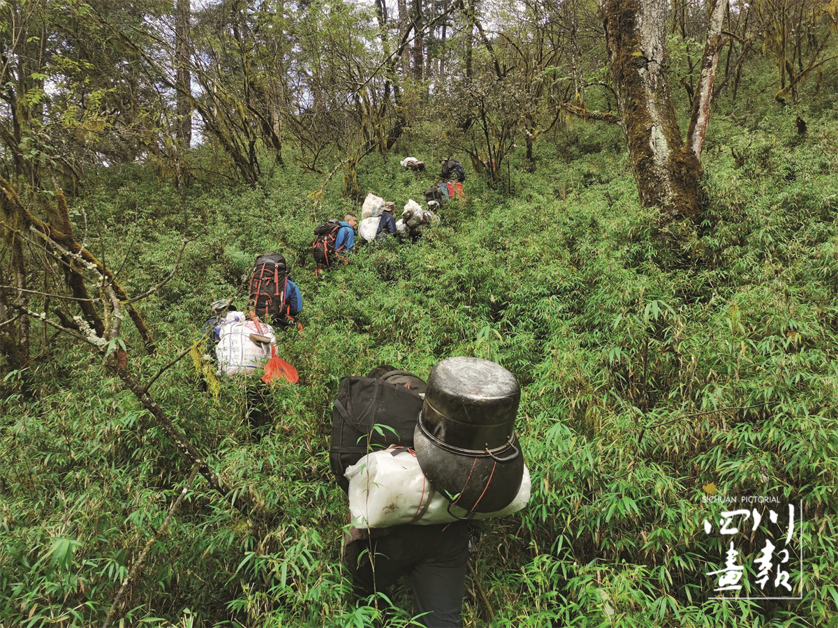 林红强和队友沿巡护监测固定样线攀爬(程跃红 摄)
