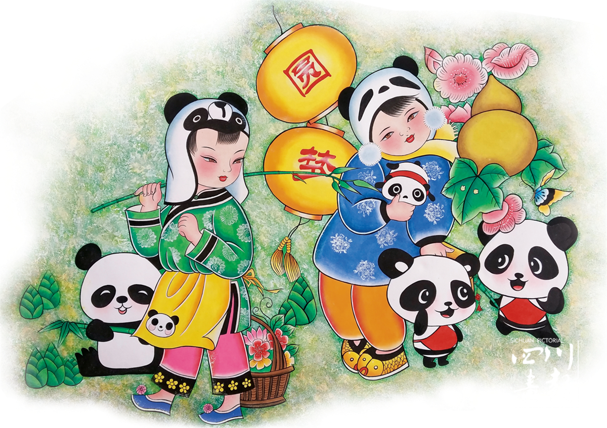 绵竹作为大熊猫栖息地,熊猫成为绵竹年画元素。图为年画作品《圆梦》(绵竹市委宣传部供图)
