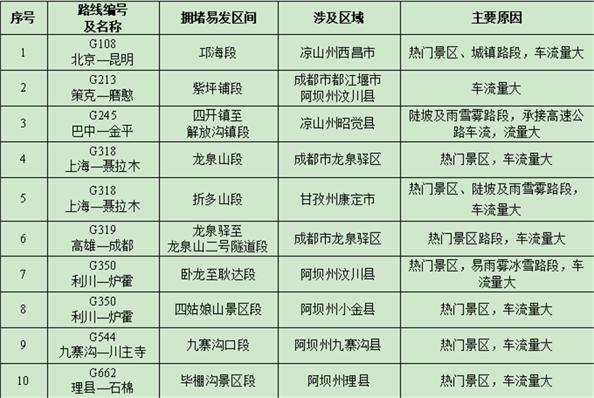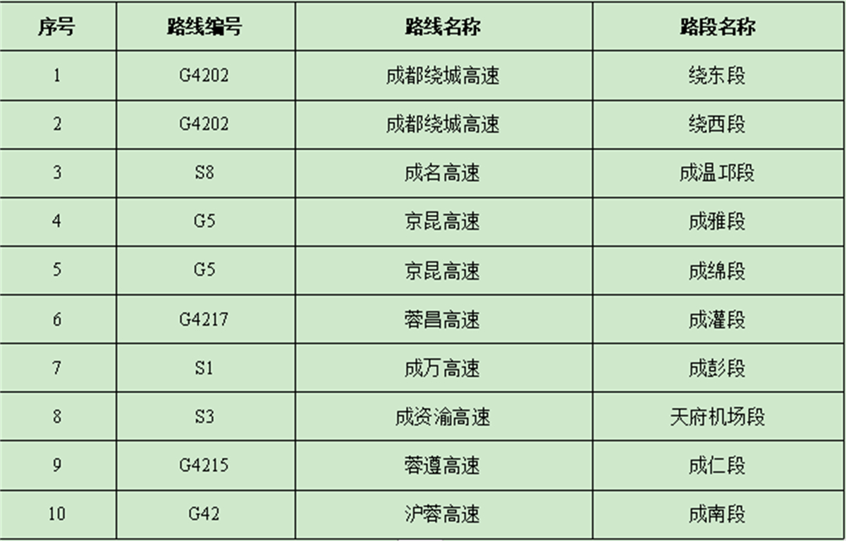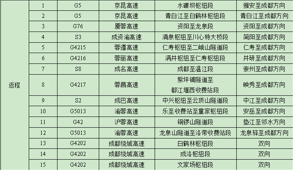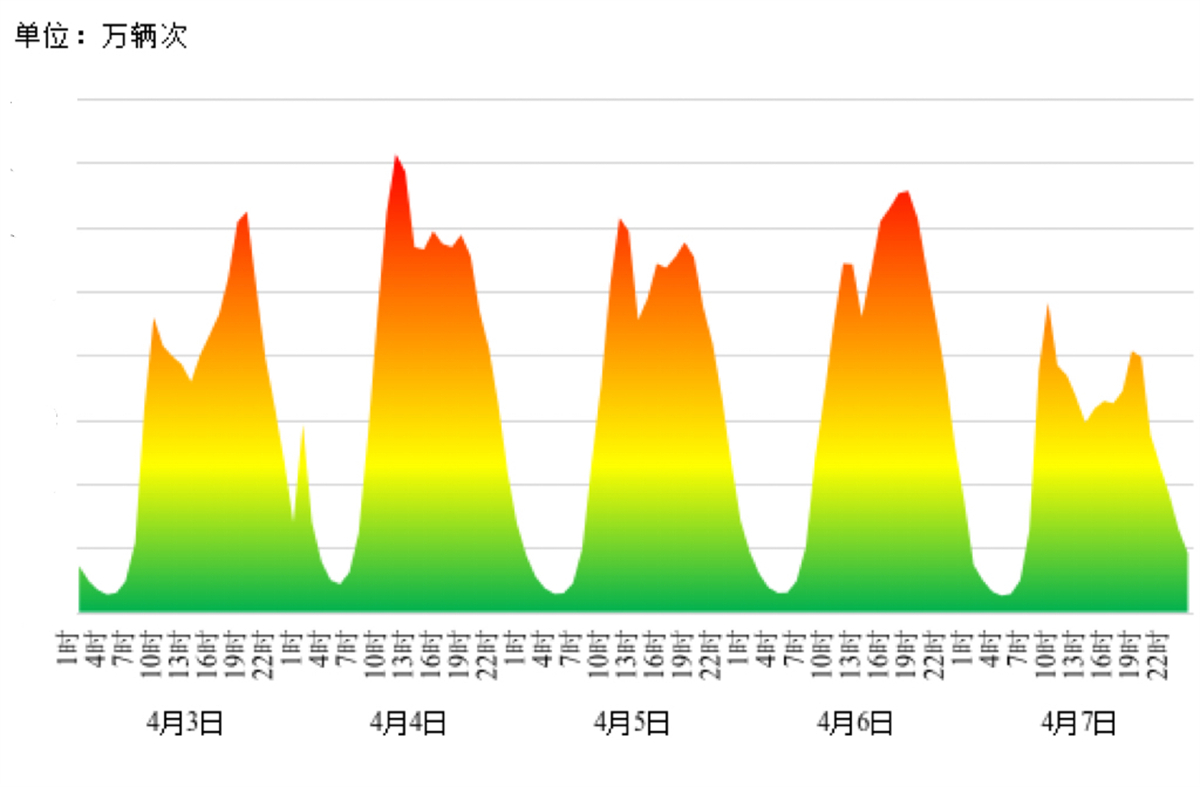 其中:跨省总流量约104.9万辆次,同比增长14.0%。其中:川渝方向流量最大,其次是川黔方向、川陕方向、川滇方向、川甘方向、川青方向。从出行时间看,流量高峰将出现在假期首日10至12时及假期最后一天15至19时,高峰小时流量突破35万辆次。4月4日(假期首日)为假期最高,4月6日(假期最后一天),受集中返程影响,部分车流量集中路段出现短时拥堵。4月7日(节后一天),路网运行基本畅通。从区域分布看。高速公路网车流量在成都平原和川南等地集中特征明显。全省高速公路流量排名前十的市(州)包括:成都、宜宾、泸州、乐山、德阳、南充、眉山、内江、绵阳、广安。