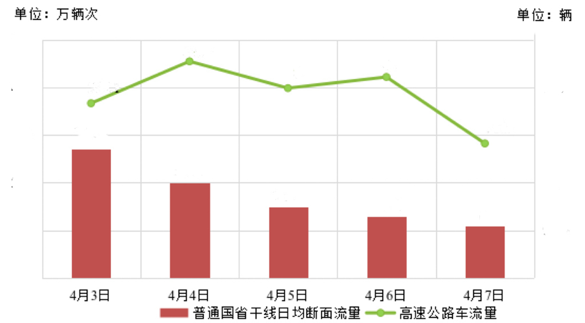 高速公路总车流量约1276.7万辆次,日均425.6万辆次,同比增长4.7%,较平时增长59.5%。普通国省干线日均断面流量约9600辆,同比增长5.4%,较平时增长2.1%。