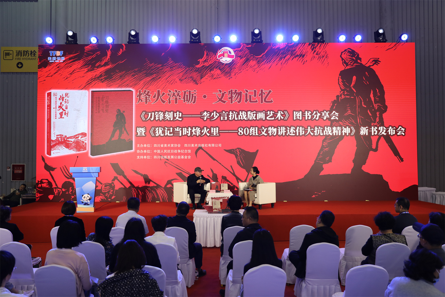 2025年10月17日下午,“烽火淬砺·文物记忆:《刀锋刻史——李少言抗战版画艺术》图书分享会暨《犹记当时烽火里——80组文物讲述伟大抗战精神》新书发布会”在2025天府书展主会场隆重举行。此次活动由四川省美术家协会、四川美术出版社主办,中国人民抗日战争纪念馆协办,四川出版发展公益基金会支持。