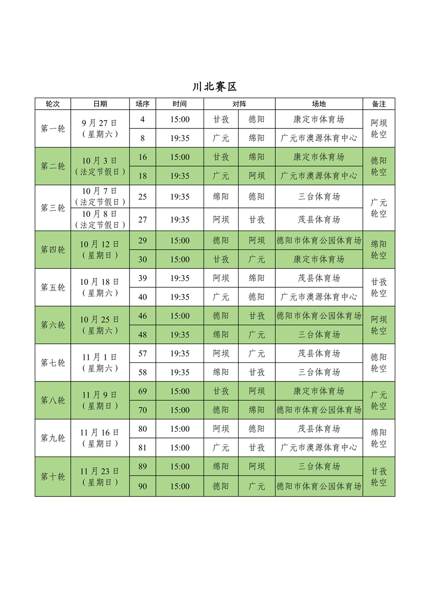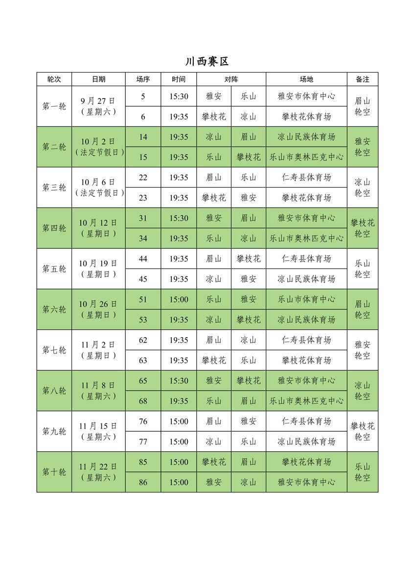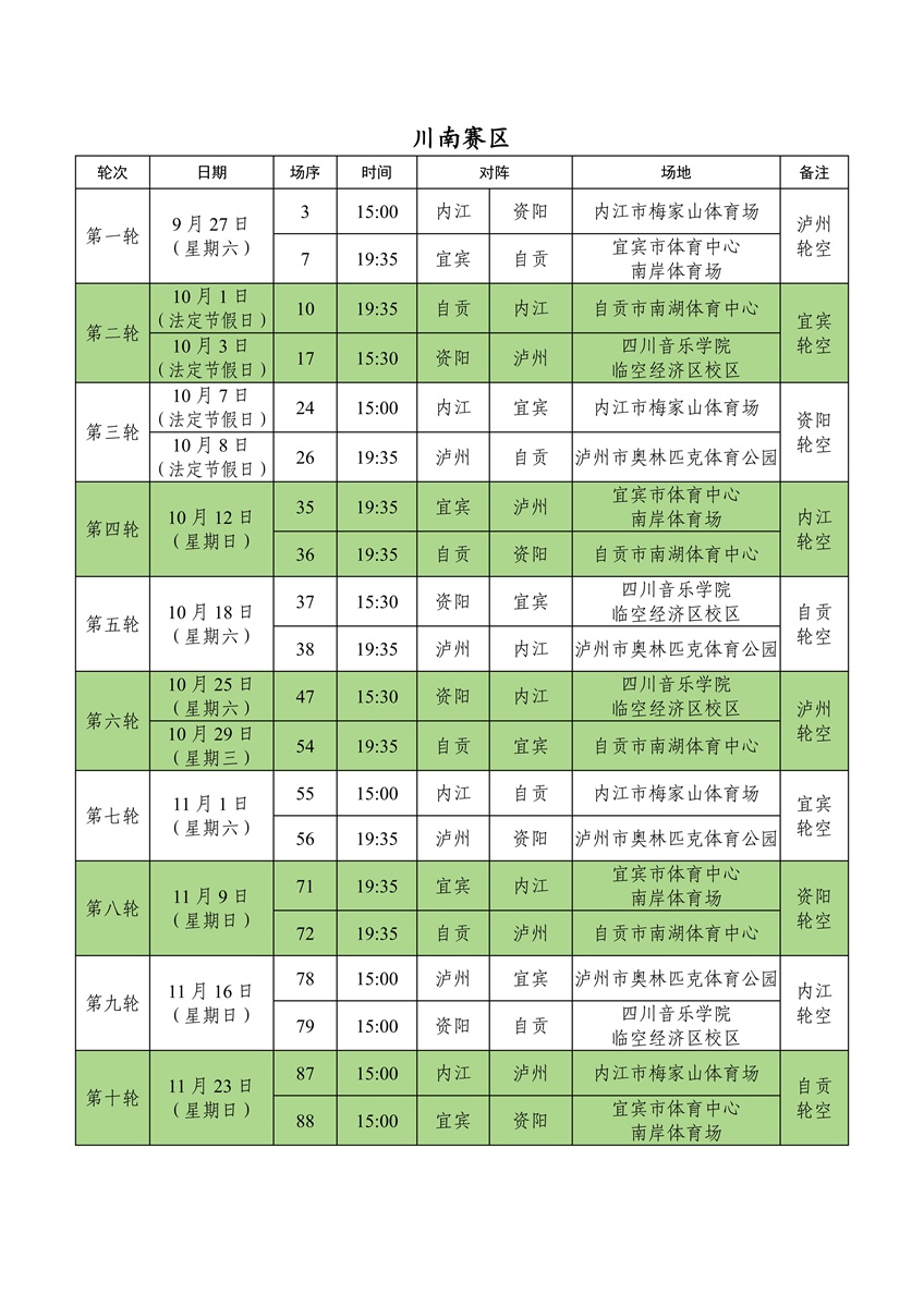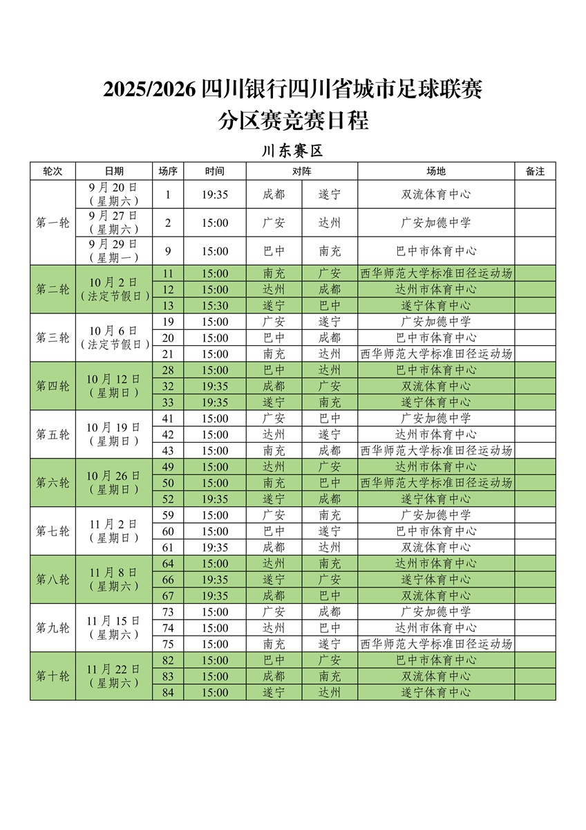 9月11日,四川省足球协会正式公布了2025/2026四川银行四川省城市足球联赛(简称“川超”)分区赛阶段的竞赛日程。赛事揭幕战定于9月20日19:35在成都双流体育中心举行,由成都队坐镇主场迎战遂宁队。