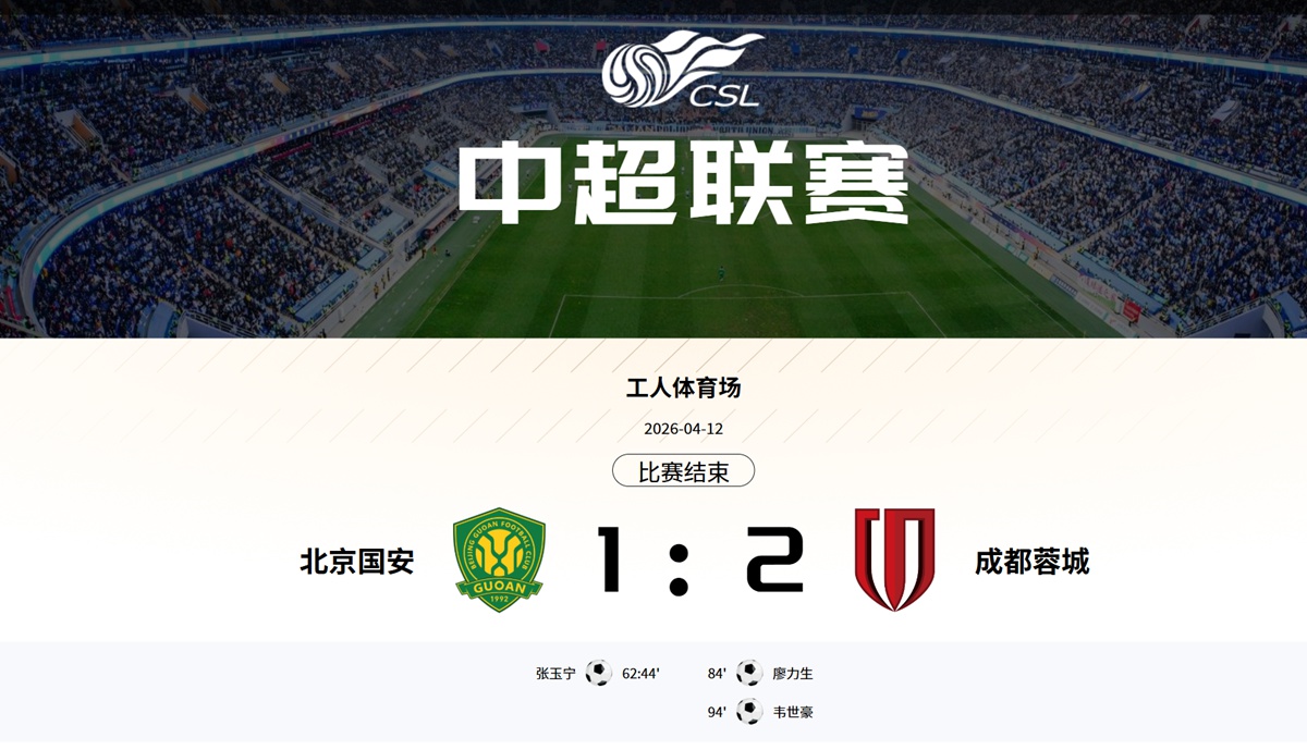 4月12日晚,2026赛季中超联赛第5轮,作客北京工人体育场的成都蓉城在先失一球的不利局面下,凭借韦世豪在比赛最后时刻的一传一射,以2:1逆转绝杀北京国安,豪取联赛两连胜。此役过后,成都蓉城以4胜1平积13分的战绩继续稳坐中超积分榜榜首位置。