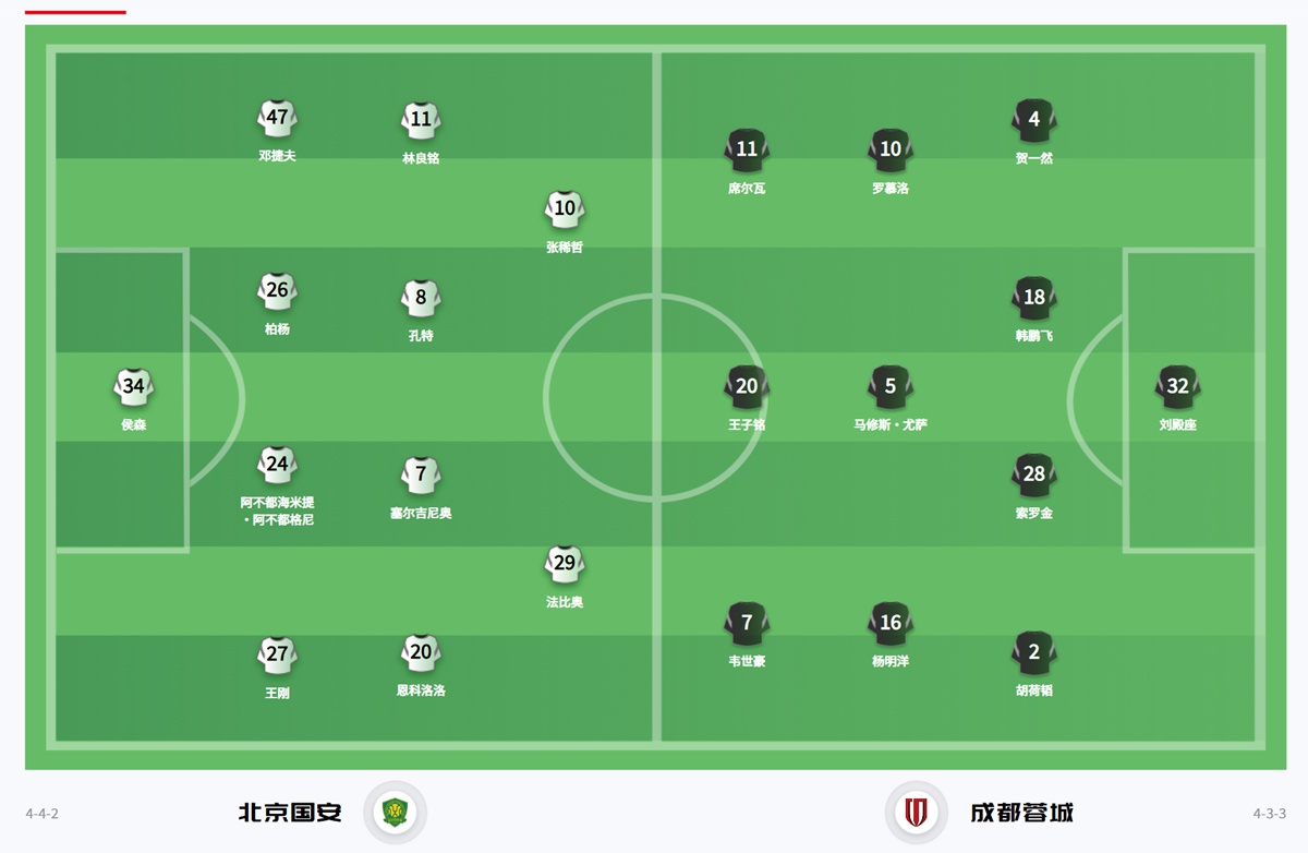 第63分钟,北京国安曹永竞送出高质量传中,张玉宁近距离头球破门,帮助国安1:0领先。第84分钟,韦林顿·席尔瓦开出角球,索罗金前点摆渡,韦世豪禁区外凌空抽射,皮球打在廖力生身上折射入网,蓉城将比分扳成1:1平。