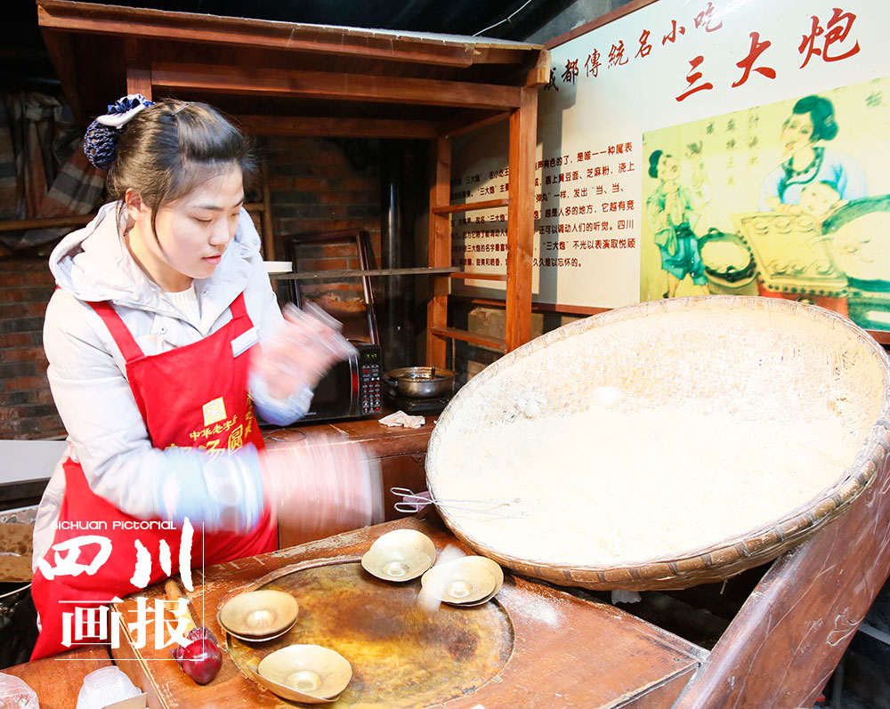 “咣!咣!咣!”——只听得三声铜碟巨响,一团洁白的糍粑便从摆放着铜碟的案板上飞向对面装满芝麻粉和黄豆面的竹簸里,转眼间变成了一个金黄诱人的小团子,散发出诱人的香气。三大炮是著名的四川传统特色小吃,香甜可口,主要由糯米制成,由于其在抛扔糯米团时会像“弹丸”