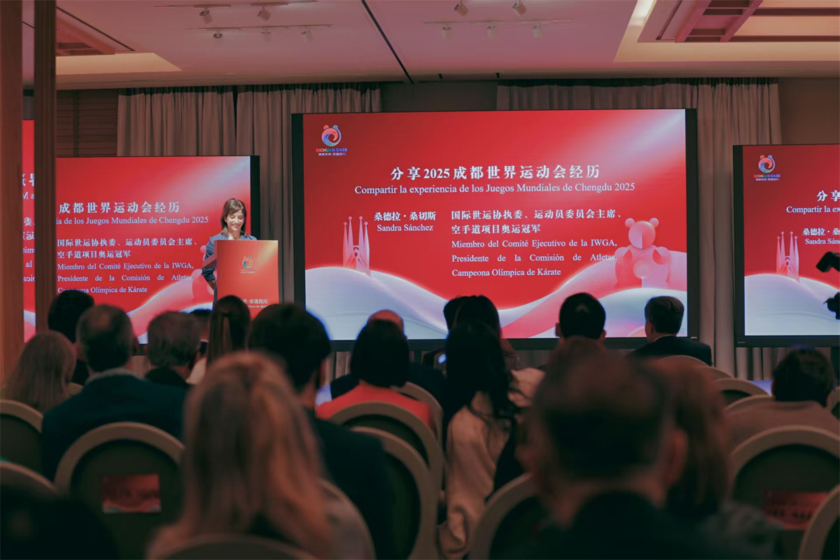 国际世运协执委、运动员委员会主席、空手道奥运冠军桑德拉·桑切斯则以亲历者视角分享她参加2025成都世运会的经历:“那里不仅有壮丽的山川,更有温暖的人情”。两位西班牙网红达人朱迪特、海梅登台,分享前不久在四川的旅游体验,真情讲述赢得全场热烈掌声。